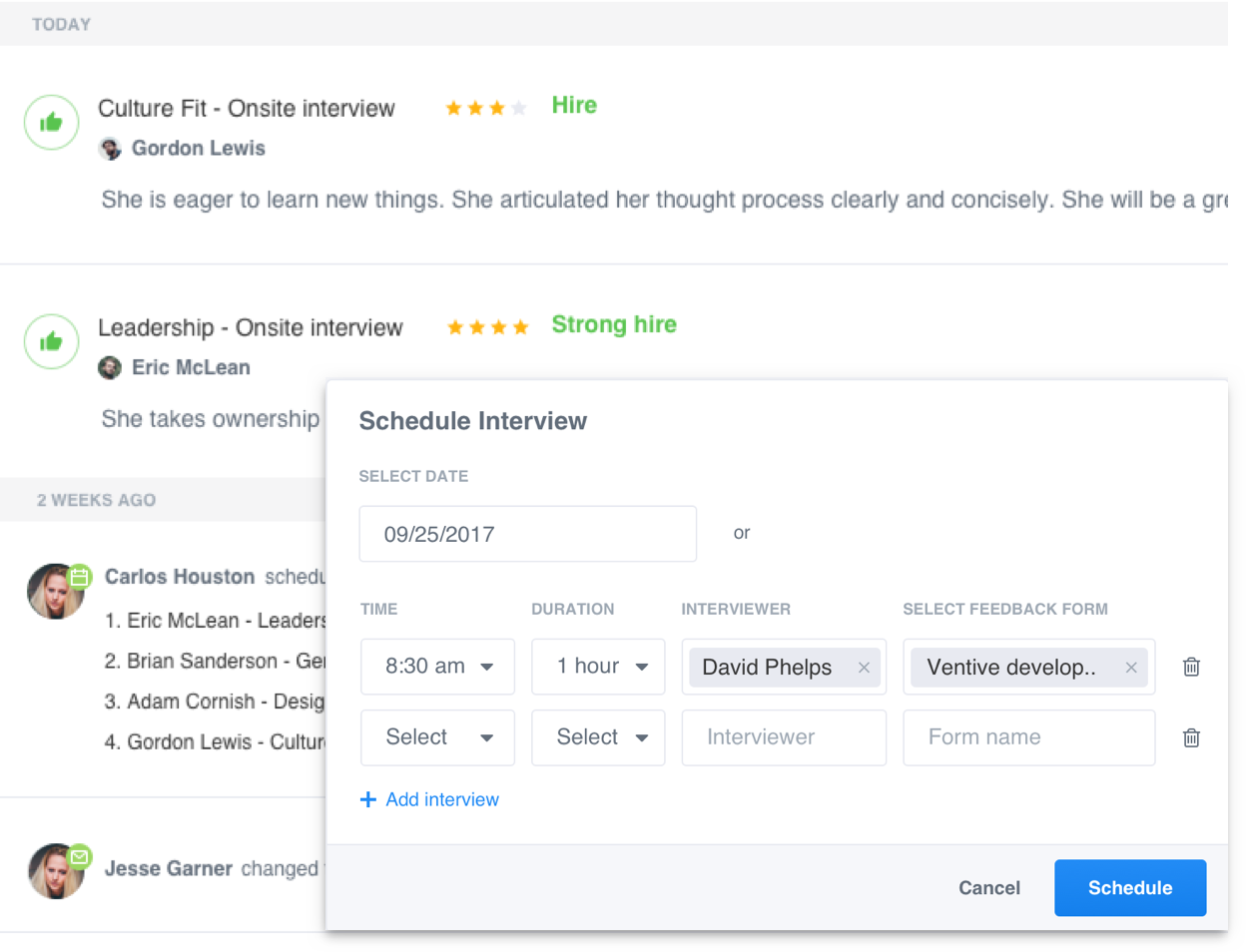 Effortlessly schedule interviews with candidates and collect feedback easily. Make interviewers better with rubric scoring and interviewing stats